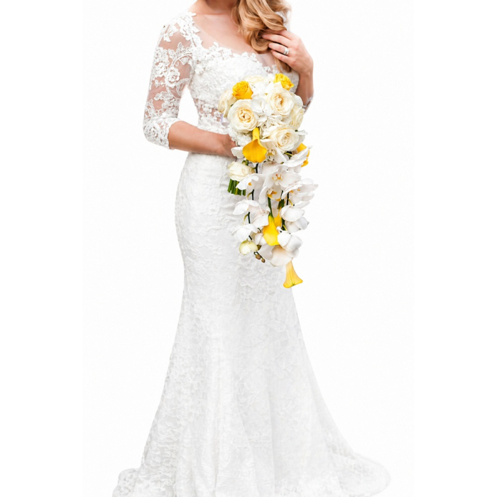 Buchetul de mireasă curgător „Royal Flow” este alegerea ideală pentru miresele care își doresc un look sofisticat și memorabil. Creat în stil cascade, acest buchet mireasă curgător Iași combină armonios trandafirii albi cu orhideele delicate și accentele florale fluide, oferind un efect spectaculos în timpul ceremoniei și în fotografii.