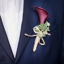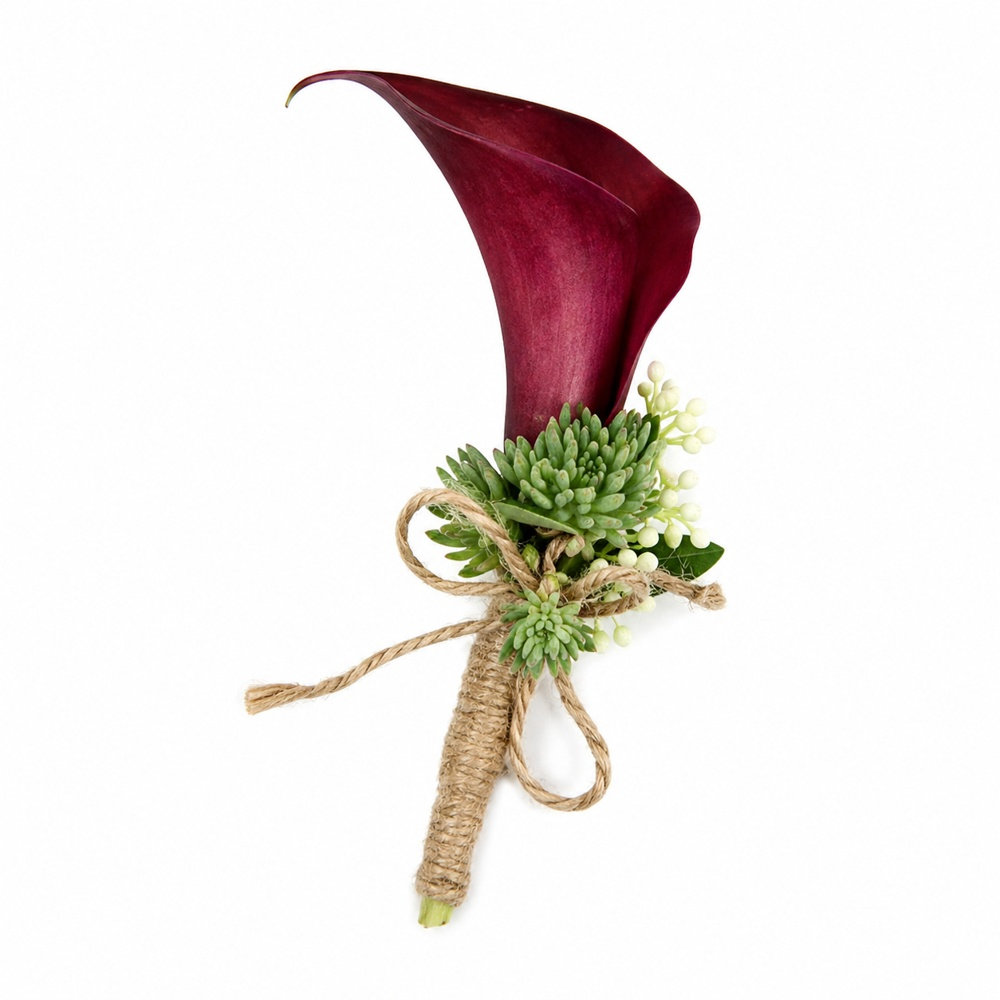 Această butonieră de nuntă în Iași este creată pentru a completa perfect ținuta mirelui, oferind un aspect elegant și sofisticat. Realizată din cală bordo și accente florale naturale, butoniera „Burgundy Calla Elegance” este alegerea ideală pentru nunți moderne și rafinate.