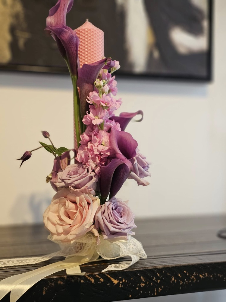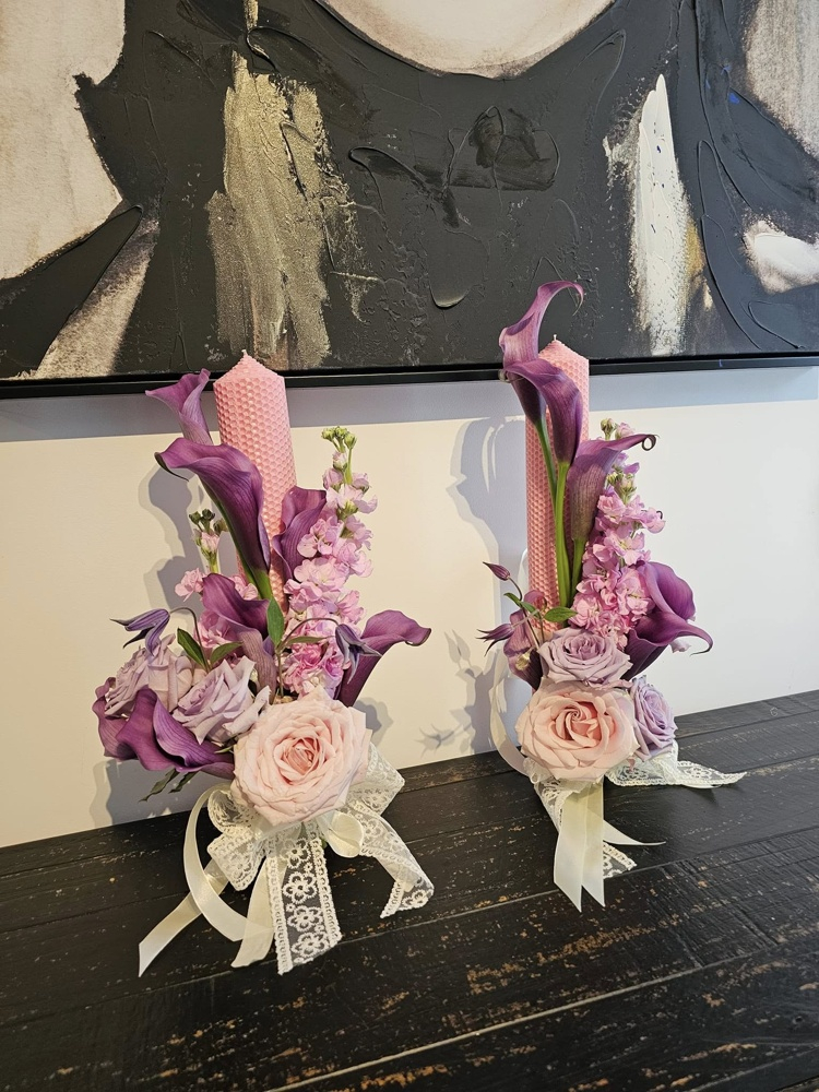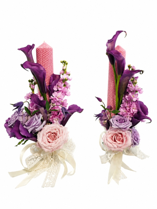 Set de lumânări pentru cununie în nuanțe mov pastel, realizat din flori naturale (trandafiri și cale), design elegant și premium, cu livrare rapidă în Iași.