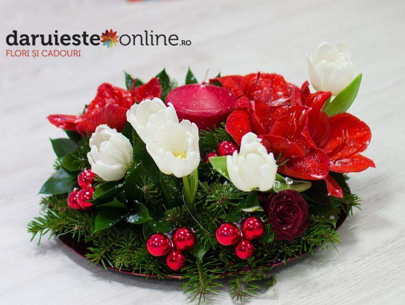 Aranjament floral pentru masa de craciun realizat din brad natural,lalele, amaryllis, globuri si lumanare pentru seara de craciun. Daruieste cele mai frumoase aranjamente naturale de craciun lucrate manual in floraria noastra.