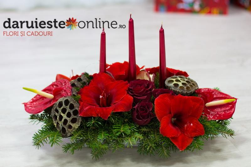 Aranjament central pentru masa de Craciun din amaryllis rosu, brad, anthurium si lumanari decorative. Daruieste cele mai frumoase aranjamente naturale de Craciun lucrate manual in floraria noastra.
