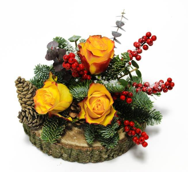 Trimite de sarbatori acest aranjament cu specific de Craciun care contine trandafiri, brad, ilex, si alte elemente de decor. Daruieste cele mai frumoase aranjamente naturale de Craciun lucrate manual in floraria noastra. Aranjamentele au livrare gratuita si sunt insotite de felicitare cadou.