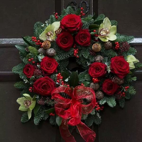 Impodobeste casa cu aceasta superba coronita de craciun confectionata din brad, trandafiri, conuri si orhidee.