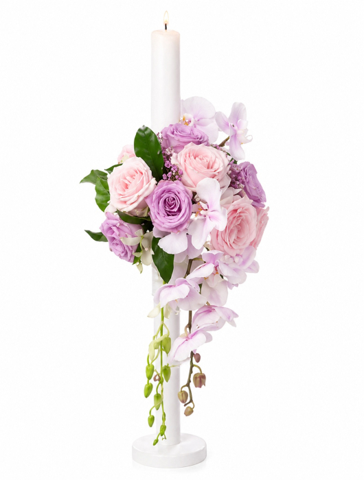 Lumânările nuntă sunt realizate din trandafiri și orhidee naturale, flori premium cu aspect elegant.